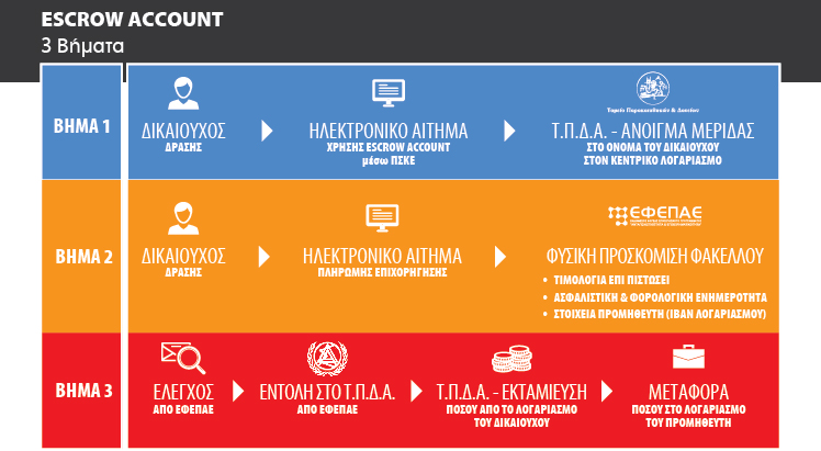 Βήμα 1: Με την υπογραφή της εγκριτικής απόφασης υπαγωγής ενός Δικαιούχου σε χρηματοδοτικό πρόγραμμα, ενεργοποιούνται και οι διαδικασίες χρήσης του Εscrow Αccount. Ειδικότερα, μετά από αίτημα του επενδυτή/Δικαιούχου, στο οποίο θα δηλώνει τη βούλησή του για χρήση του escrow και τη δήλωση προσχώρησης στη σύμβαση, δημιουργείται στον Εscrow Αccount, που αφορά τη δράση στην οποία έχει ενταχθεί, υπο-λογαριασμός/μερίδα στο όνομά του.
